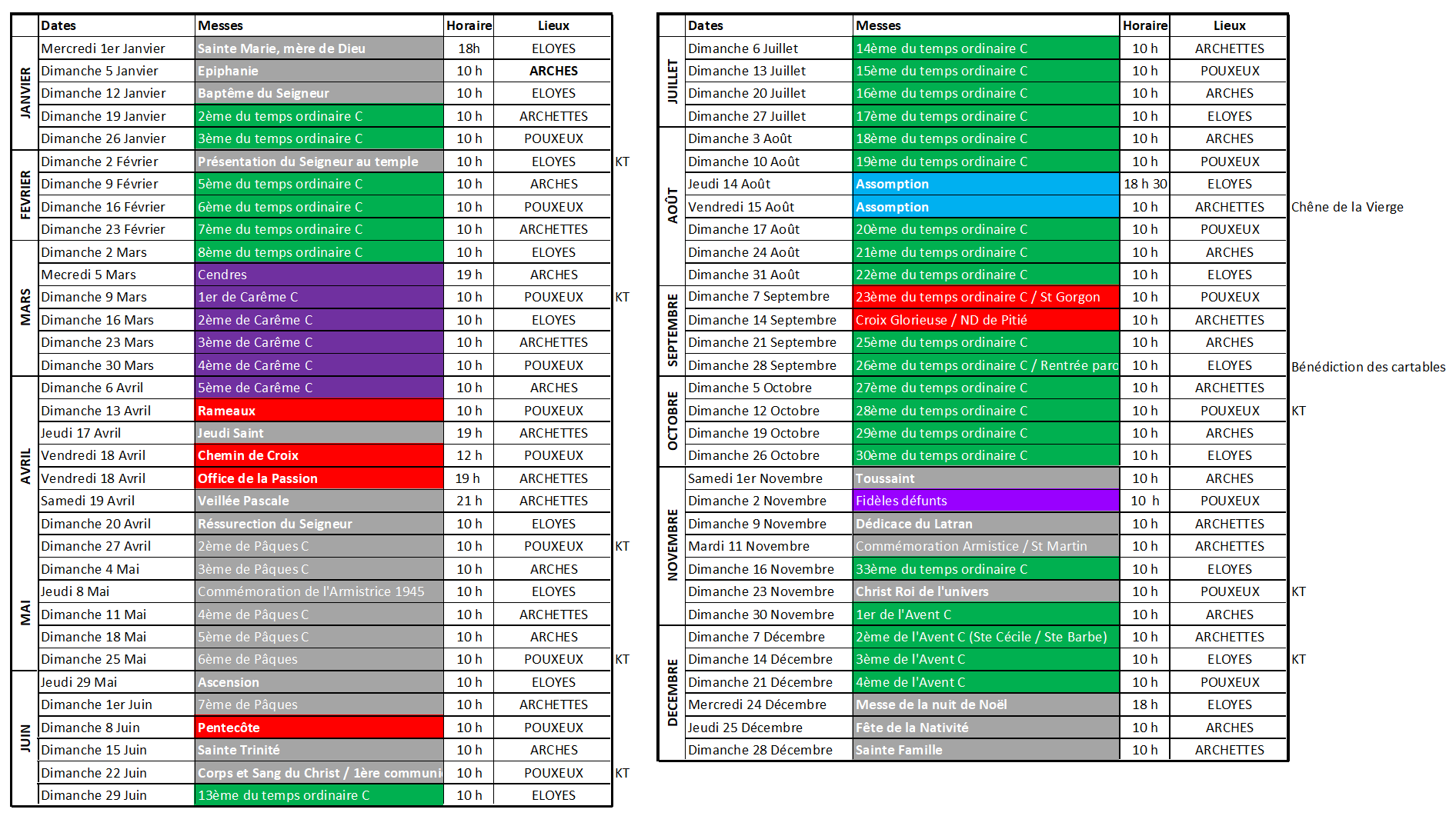 Calendrier des messes 2025